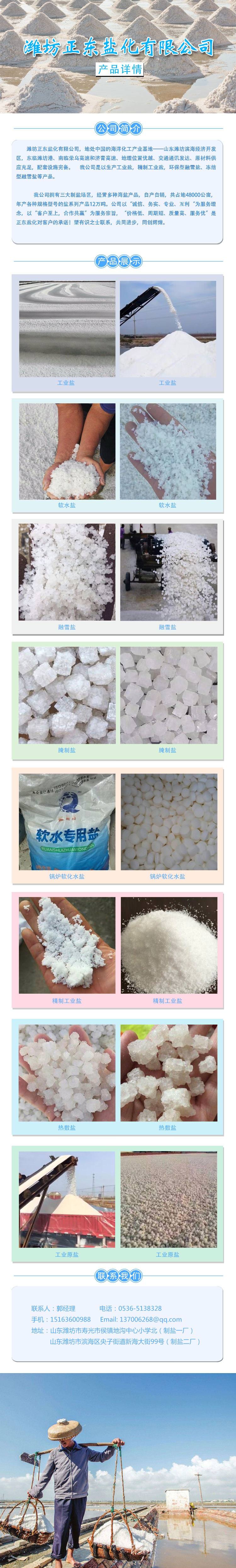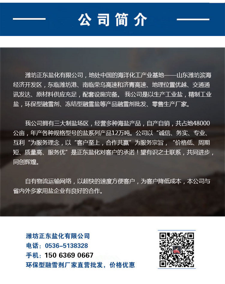 濰坊正東鹽化有限公司,地處中國的海洋化工產(chǎn)業(yè)基地——山東濰坊濱海經(jīng)濟開發(fā)區(qū),東臨濰坊港、南臨榮烏高速和濟青高速、地理位置優(yōu)越、交通通訊發(fā)達、原材料供應(yīng)充足,配套設(shè)施完備。 我公司是以生產(chǎn)工業(yè)鹽,日曬鹽,軟水鹽,精制工業(yè)鹽,飼料添加劑氯化鈉,凍結(jié)型融雪鹽等產(chǎn)品工業(yè)鹽批發(fā)生產(chǎn)廠家。